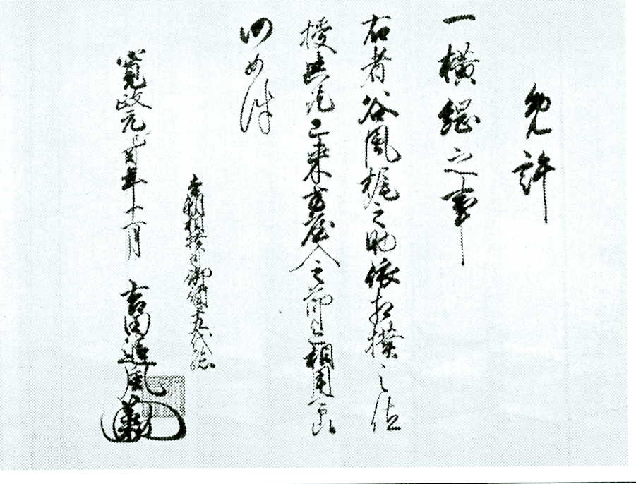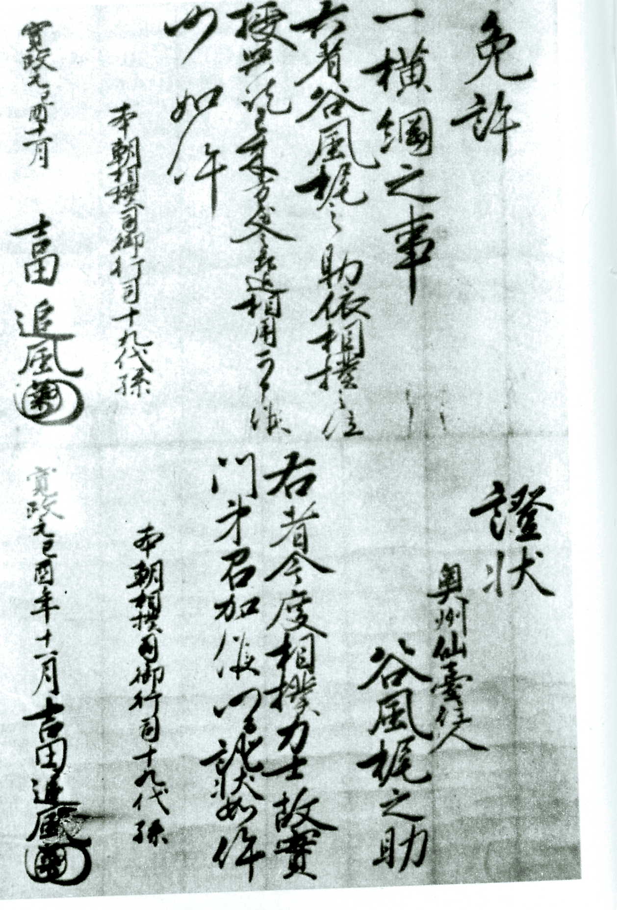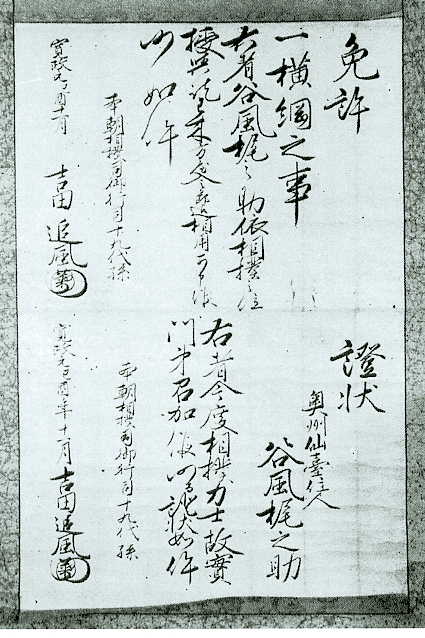 免許 一横綱之事 右者谷風梶之助依相撲之位令授與 畢以来方屋入之節迄相用可申候 仍如件 本朝相撲之司御行事十九代