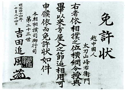 免 状 梅ヶ谷藤太郎 右者方屋入之節迄太刀令免許畢仍而免状如件 明治十七年二月十九日 本朝相撲司二十三代 吉田追風代理 清田 直 以下参考のため他の資料より画像を示す。 谷風の横綱免許 谷風の横綱免許と故実門人の証状 但し後世の偽物と言われる 太刀山の横綱免許 免許状 越中国人 太刀山峰右衛門 右者依相撲之位横綱令授與 畢以来方屋入之節迄相用可 申候依而免許状仍如件 本朝相撲司御行司 第二十三世 明治四十四年 十月二十四日 吉田追風