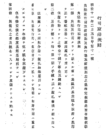 第 十二 条 一、組合取締年番人撰の儀は御布達条三条に照準し、年寄一同実印を以て入札投票之上年番並組長相定候。万一年番の者と雖ども私意を窓にし不正の廉有之節は、年寄一同の協議を以て権任を解き、年番を廃し更に年番を撰定し其趣警視御本庁へ御届け可申出事。 右之 条々堅相守可申事。