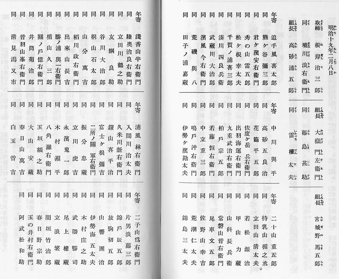 条 四十七 条 年寄の名義を永遠に継続する為自今年寄八十名及左に掲ぐる旧年寄八名の名義を継ぐもの外本会へ加入する事を許さず。 高島五郎治 錦島三太夫 佐ノ山幸吉 田子ノ浦嘉蔵 常盤山音右エ門 山響団蔵 関ノ戸億右エ門 待乳山楯之丞